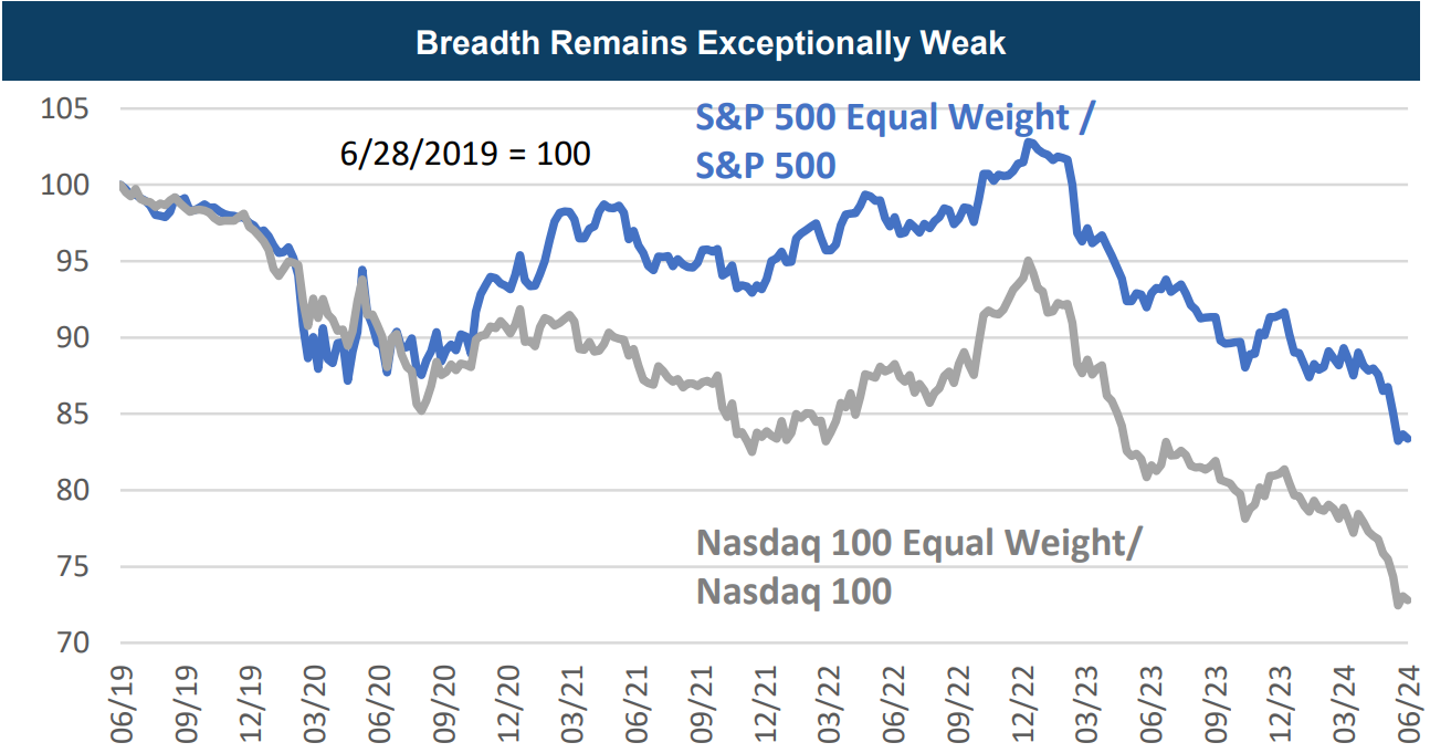 The degree of market narrowing reached levels rarely seen historically. Equal-weight indices lagged their cap-weighted counterparts by a wide margin, reflecting exceptionally weak breadth across both large cap and growth-oriented benchmarks